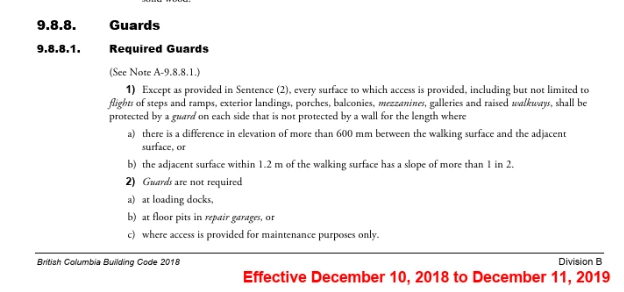 Municipalities such as Vancouver may enforce stricter interpretations (for example, Vancouver often enforces 42″ guard height everywhere).